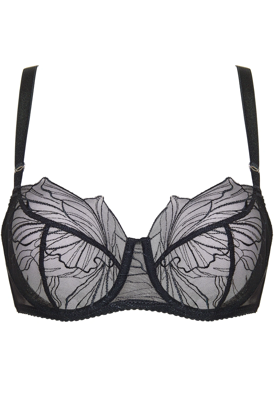 Miękkie, półprzeźroczyste miseczki na fiszbinach, uszyte z haftu ozdobionego srebrną nicią, Plecy wykonane z wzmocnionego tiulu elastycznego, Srebrne ozdoby z regulacją wysokości umieszczone na ramiączkach, Regulowane, nieodpinane ramiączka, Pionowe fiszbiny boczne zapobiegające marszczeniu się boczków, Biustonosz zaprojektowano i uszyto w Polsce, W celu utrzymania bielizny w dobrej kondycji przez długi czas zaleca się delikatne pranie ręczne w temperaturze 30°C, Modelka ma 180 cm wzrostu i nosi rozmiar 70E.Szczegółowe dane